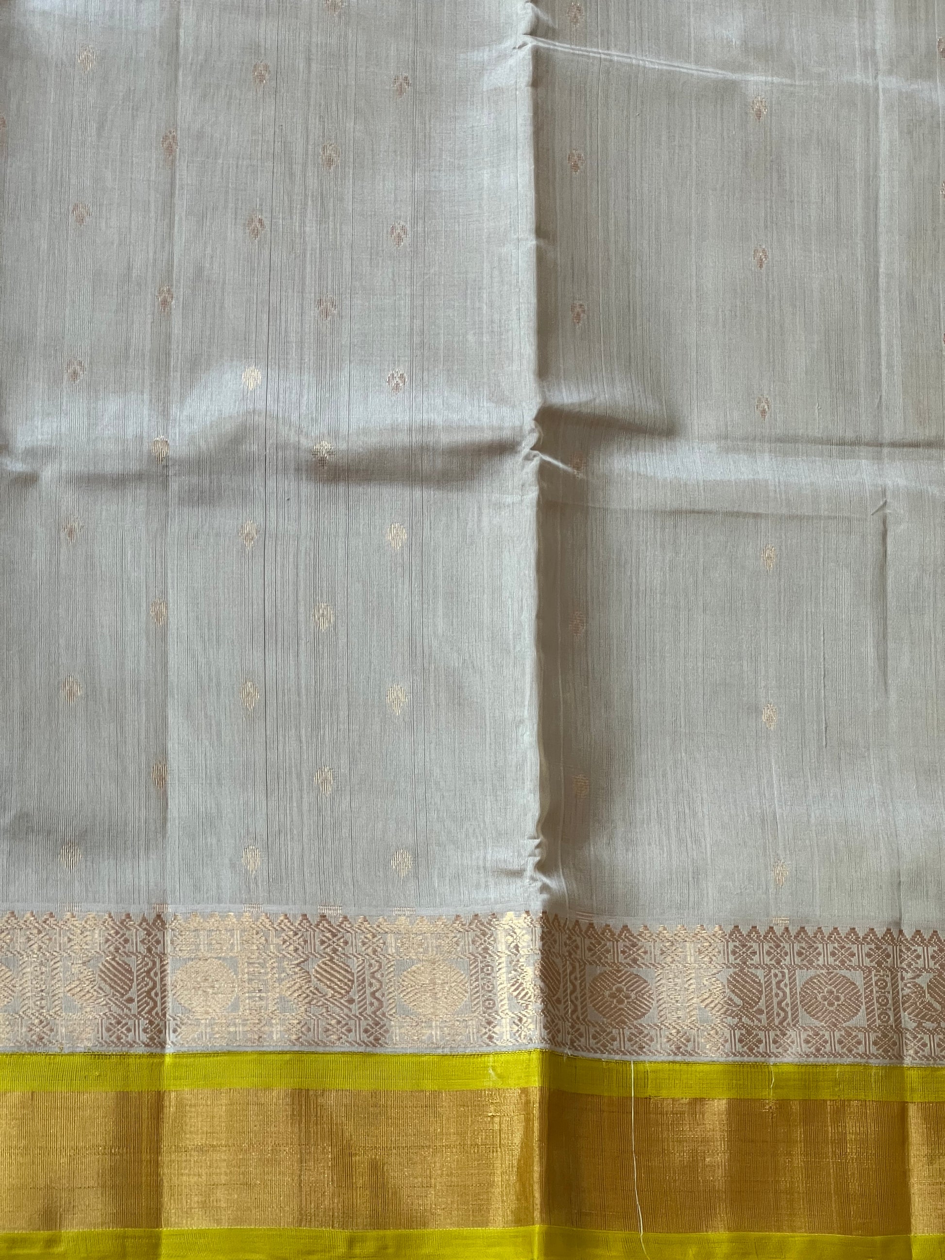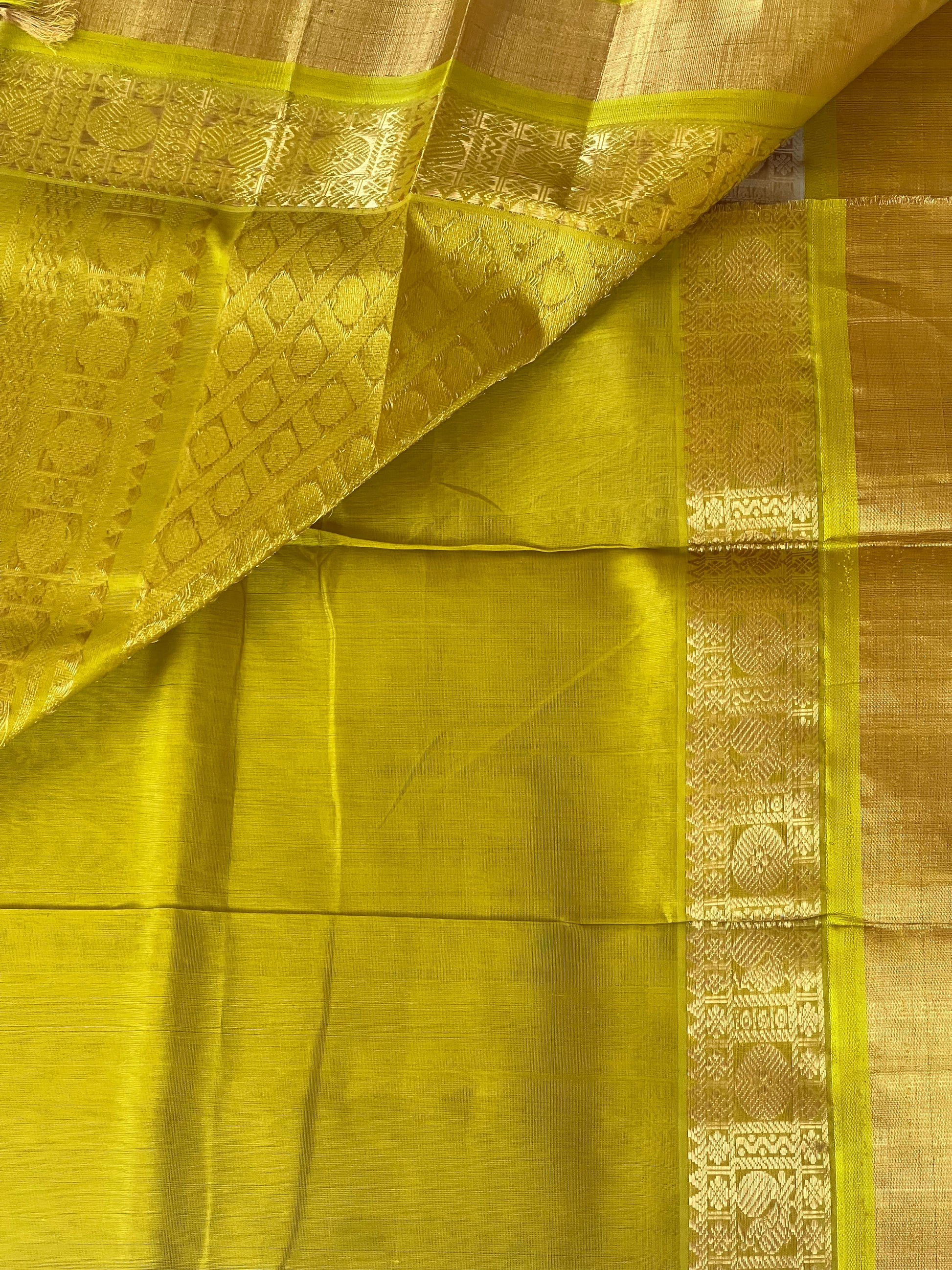 Soft beige body paired with a dark lime-yellow border creates a striking contrast