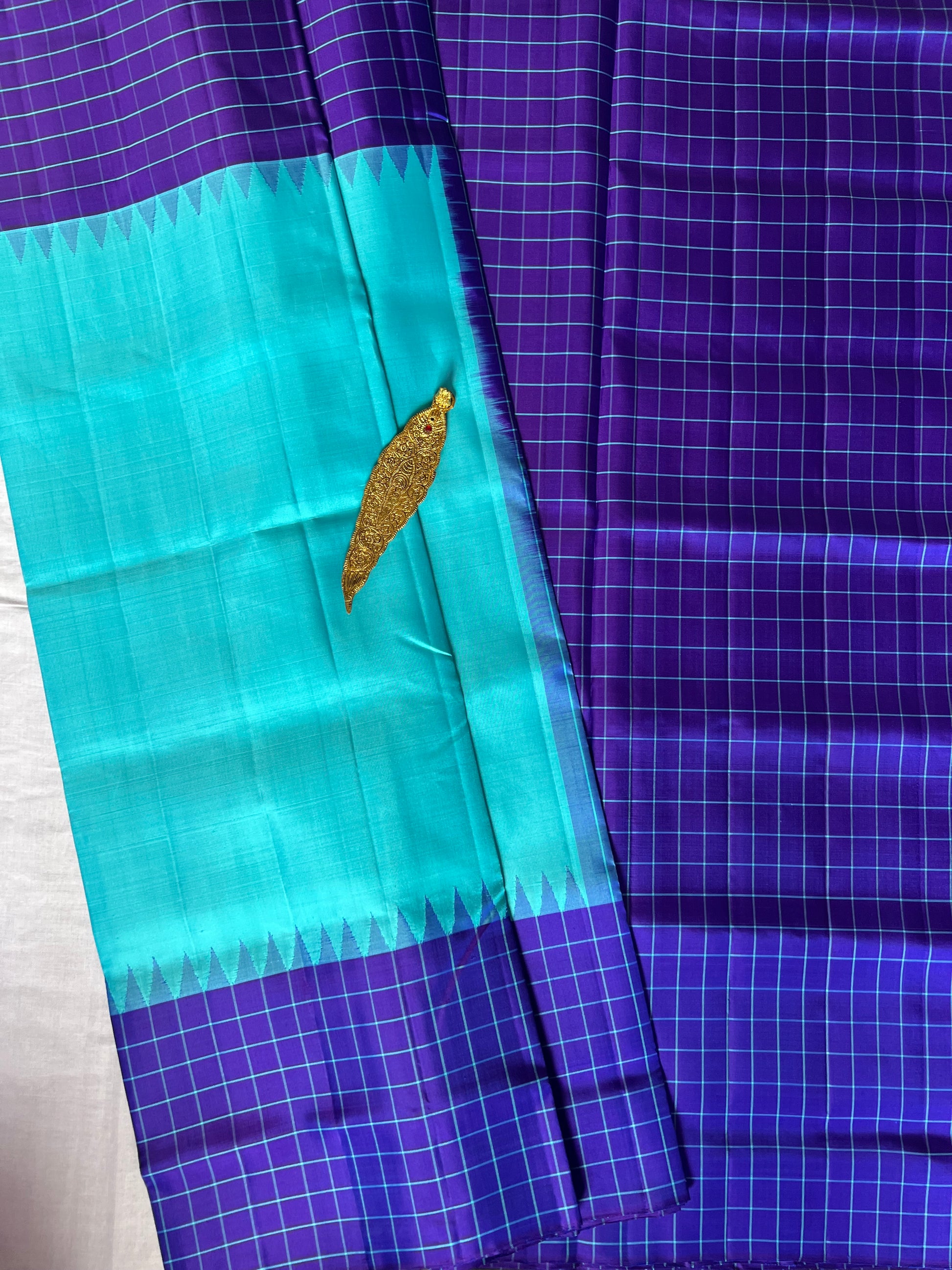 Two lovely shades of blue come together in this pure Kanchivaram Silk saree