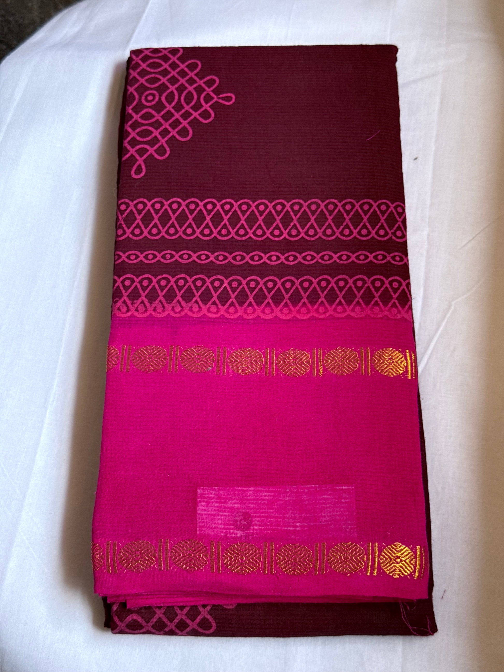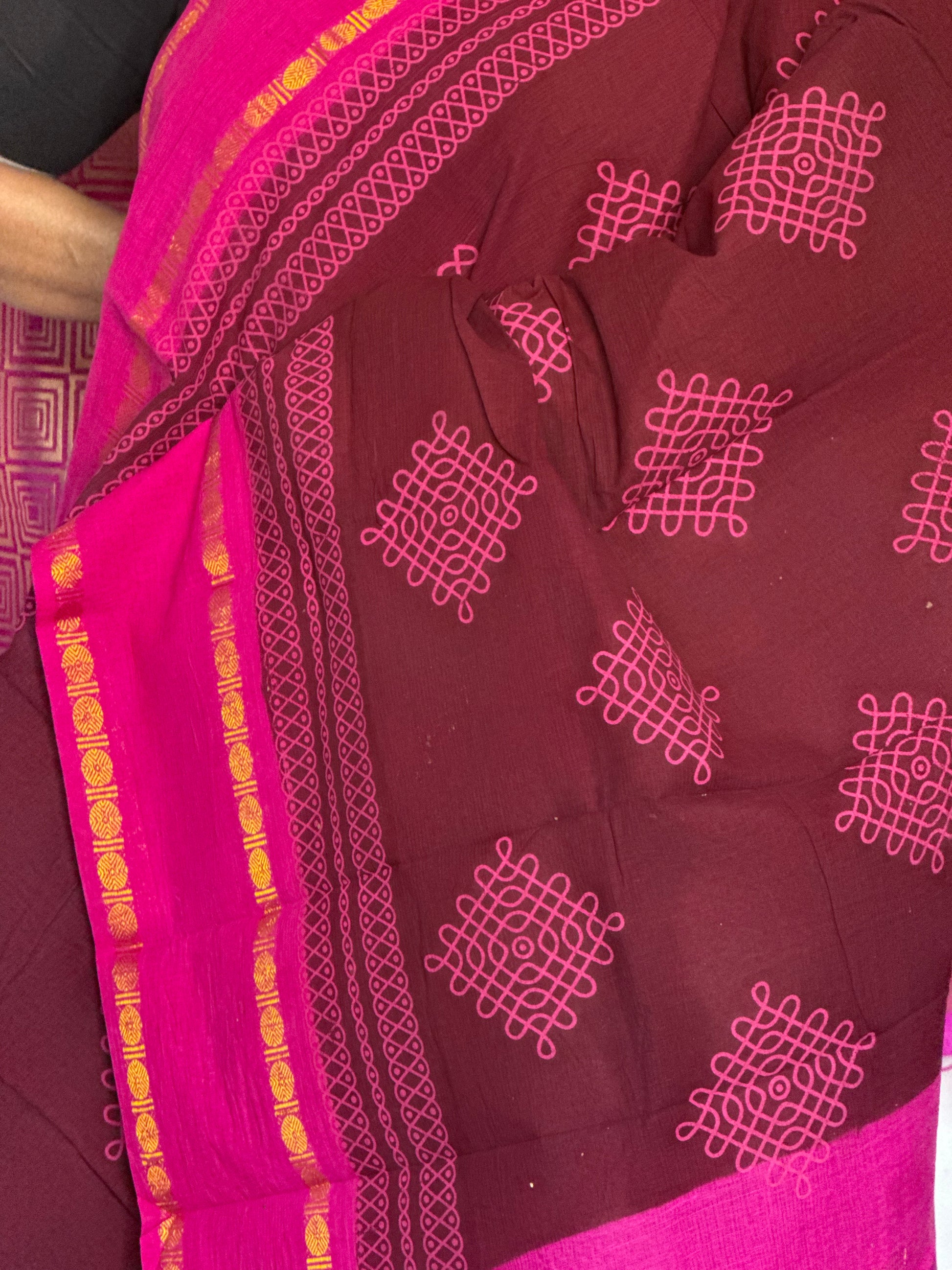 Pink Sungudi saree paired with a matching Sungudi blouse featuring kolam prints.