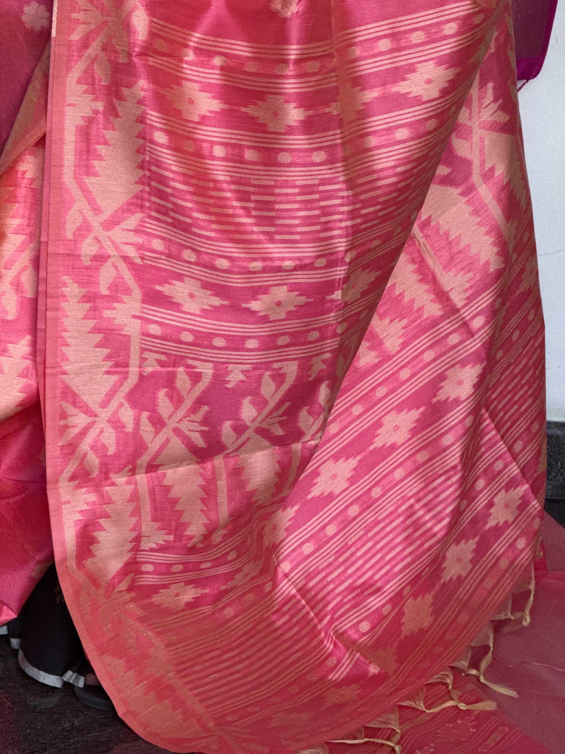A beautiful coral-peach silk saree that blends soft warmth with a radiant sheen.