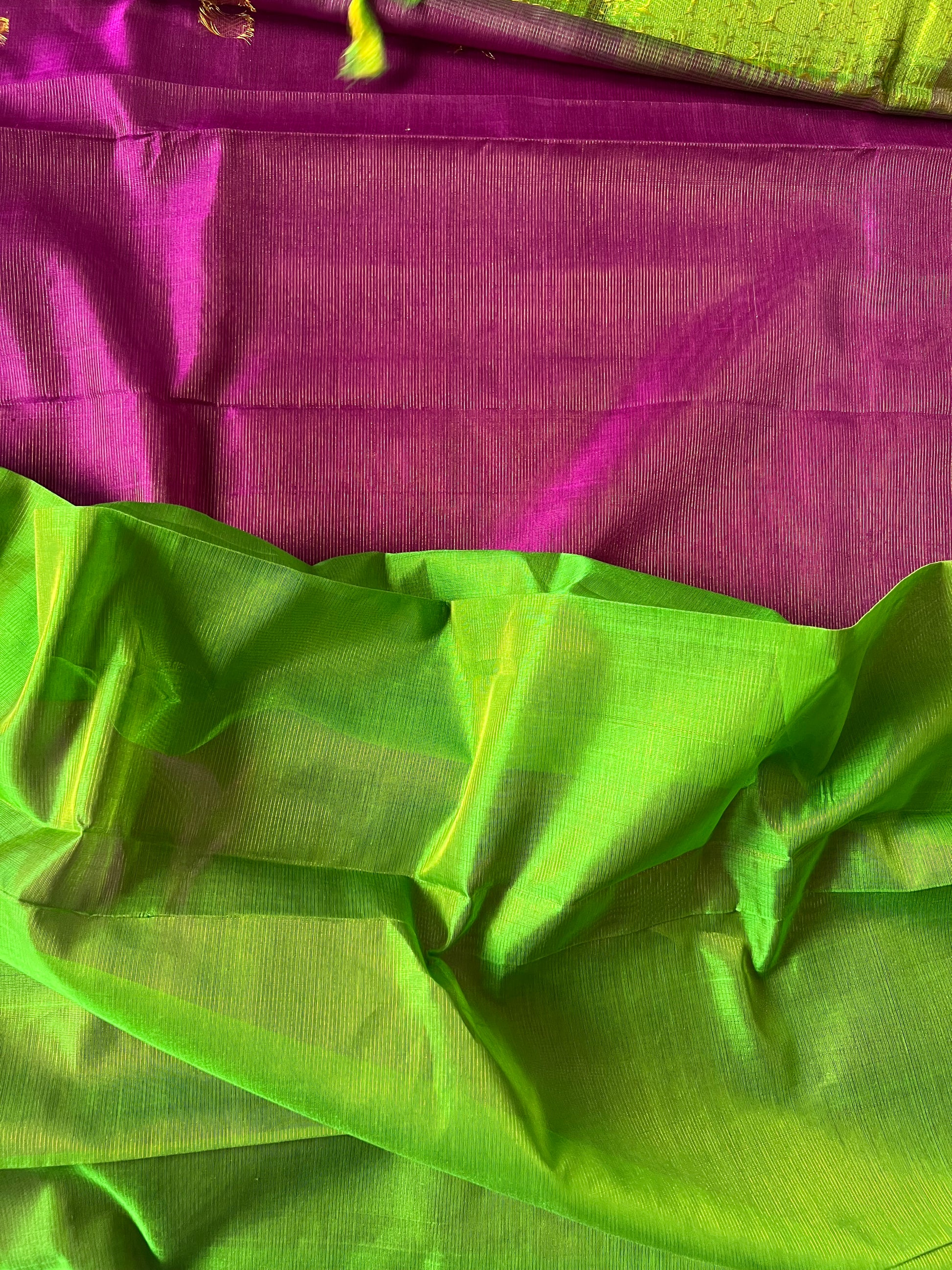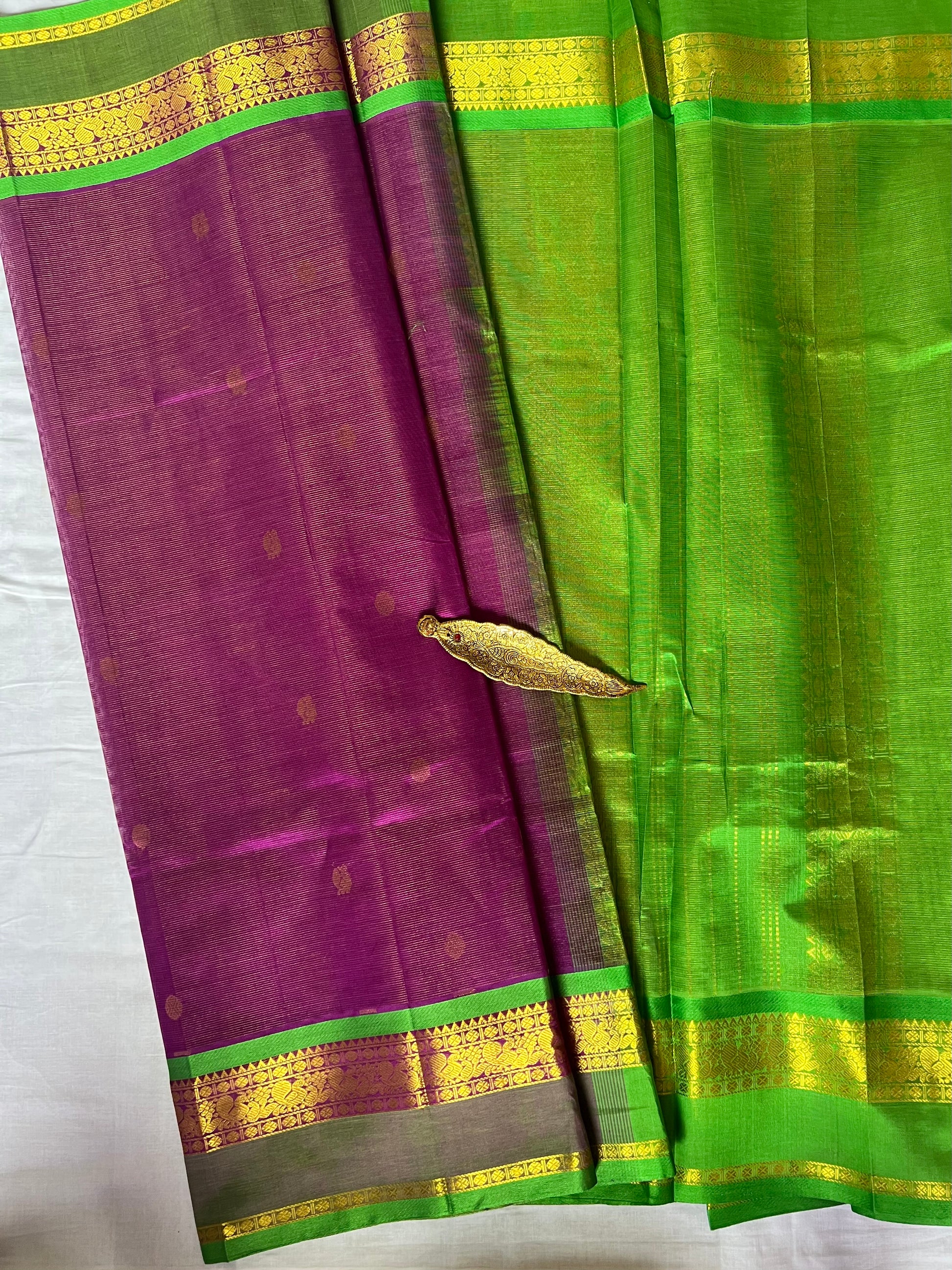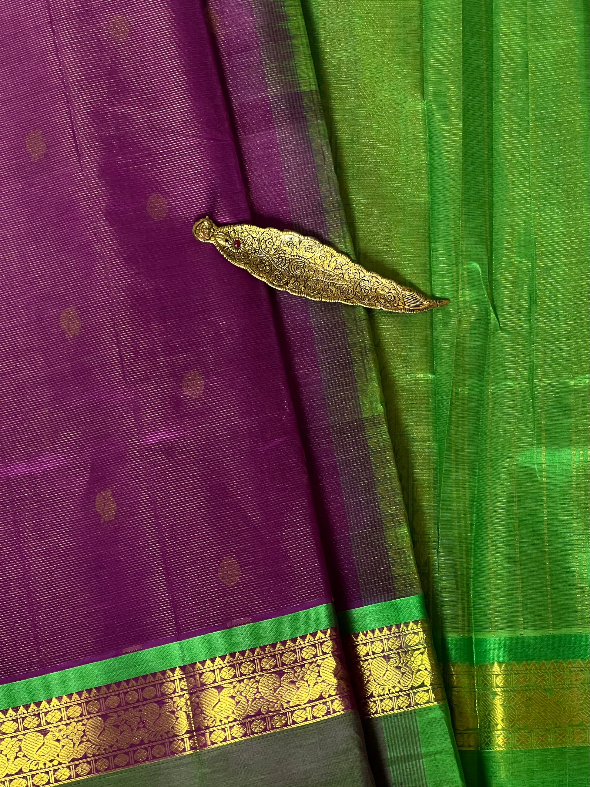 The intricate beauty of Vaira Oosi woven into a graceful Kanchi silk cotton saree. The timeless combination of green and pink makes this a truly classic piece.